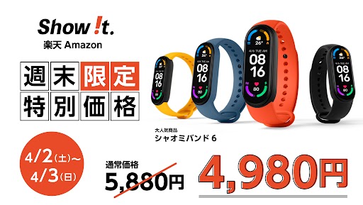 楽天「Show !t」とAmazon「Show !t」では、4月2日(土)と4月3日(日)の週末限定セールを実施します。大人気のスマートウォッチ、シャオミのバンド6を通常価格5,880円を4,980円の特別価格でご購入いただけます。運動の習慣をつけたい方や、健康管理に便利でおすすめです。この機会にぜひ取り入れてみませんか。