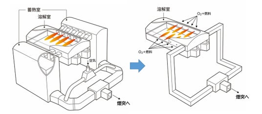 従来の燃焼方式(左)、酸素燃焼方式(右)