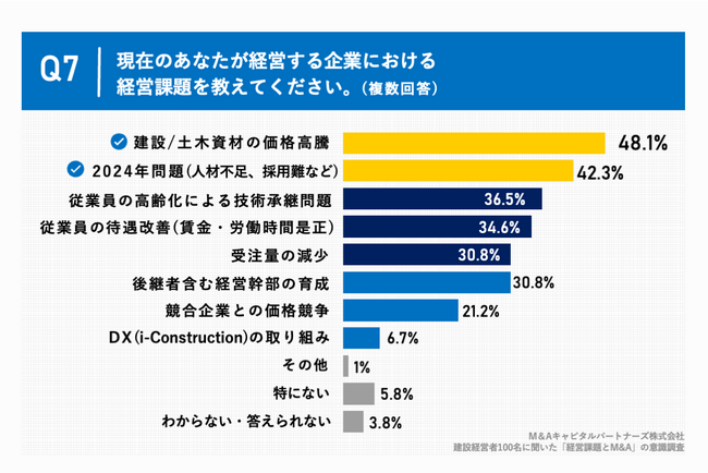 「Q7.現在のあなたが経営する企業における経営課題を教えてください。(複数回答)」(n=104)と質問したところ、「建設/土木資材の価格高騰」が48.1%、「2024年問題(人材不足、採用難など)」が42.3%、「従業員の高齢化による技術承継問題」が36.5%という回答となりました。