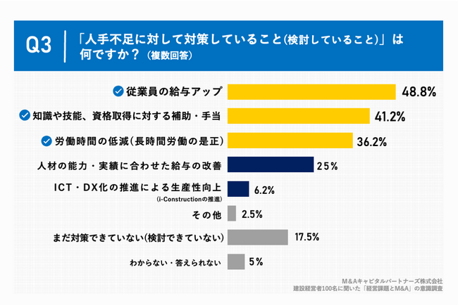 Q1で「非常に感じる」「やや感じる」と回答した方に、「Q3.「人手不足」に対して対策していること(検討していること)は何ですか。(複数回答)」(n=80)と質問したところ、「従業員の給与アップ」が48.8%、「知識や技能、資格取得に対する補助・手当」が41.2%、「労働時間の低減(長時間労働の是正)」が36.2%という回答となりました。また、「まだ対策できていない(検討できていない)」という回答が17.5%に上りました。