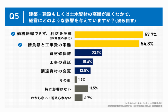 「Q5.建築・建設もしくは土木資材の高騰が続くなかで、経営にどのような影響を与えていますか。(複数回答)」(n=104)と質問したところ、「価格転嫁できず、利益を圧迫(採算性の悪化)」が57.7%、「請負額と工事費の乖離」が54.8%、「資材確保難」が23.1%という回答となりました。