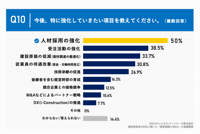 「Q10.今後、特に強化していきたい項目を教えてください。(複数回答)」(n=104)と質問したところ、「人材採用の強化」が50.0%、「受注活動の強化」が38.5%、「建設原価の低減(資材調達の最適化)」が33.7%という回答となりました。「M&Aなどによるパートナー戦略」は10.6%となりました。