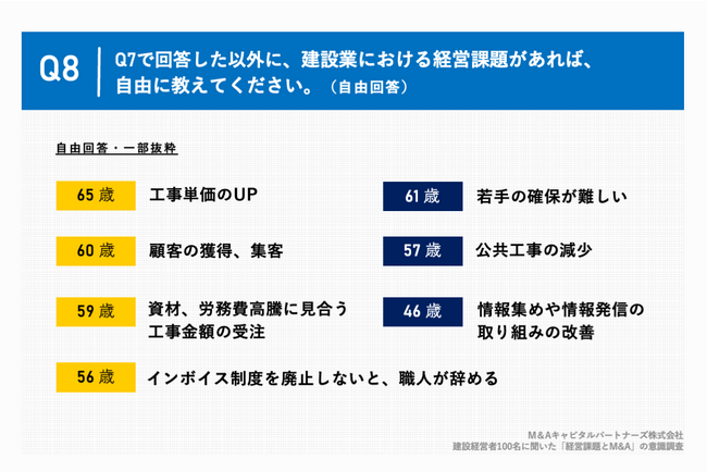 Q7で「特にない」「わからない/答えられない」以外を回答した方に、「Q7で回答した以外に、建設業における経営課題があれば、自由に教えてください。(自由回答)」(n=94)と質問したところ、「資材、労務費高騰に見合う工事金額の受注」や「若手の確保が難しい」など44の回答を得ることができました。