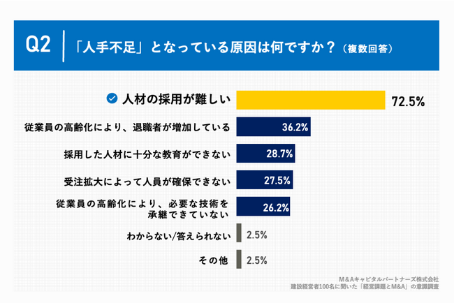 Q1で「非常に感じる」「やや感じる」と回答した方に、「Q2.「人手不足」となっている原因は何ですか。(複数回答)」(n=80)と質問したところ、「人材の採用が難しい」が72.5%、「従業員の高齢化により、退職者が増加している」が36.2%、「採用した人材に十分な教育ができない」が28.7%という回答となりました。