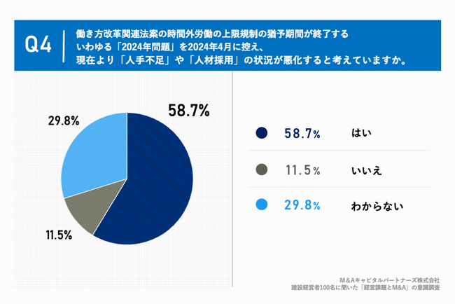 「Q4.働き方改革関連法案の時間外労働の上限規制の猶予期間が終了するいわゆる「2024年問題」を2024年4月に控え、現在より「人手不足」や「人材採用」の状況が悪化すると考えていますか。」(n=104)と質問したところ、「はい」が58.7%、「いいえ」が11.5%という回答となりました。