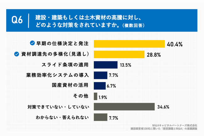 「Q6.建築・建設もしくは土木資材の高騰に対し、どのような対策をされていますか。(複数回答)」(n=104)と質問したところ、「早期の仕様決定と発注」が40.4%、「資材調達先の多様化(見直し)」が28.8%、「スライド条項の適用」が13.5%という回答となりました。