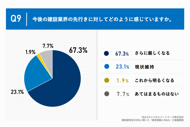 「Q9.今後の建設業界の先行きに対してどのように感じていますか。」(n=104)と質問したところ、「さらに厳しくなる」が67.3%、「現状維持」が23.1%という回答となりました。