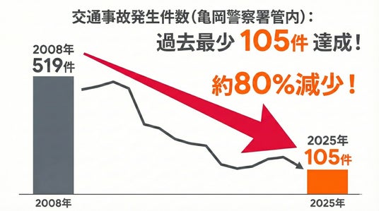 京都府亀岡市(市長:桂川孝裕)は、2月20日の「交通事故死ゼロを目指す日」に合わせ、本市の交通安全対策の成果を公表いたします。 2025年中の交通事故件数は105件となり、2年連続の減少かつ、統計が残る中で過去最少を更新しました。この結果は、本市が日本初の「セーフコミュニティ」国際認証を取得した2008年(519件)と比較して約80%の減少したことを示しています。