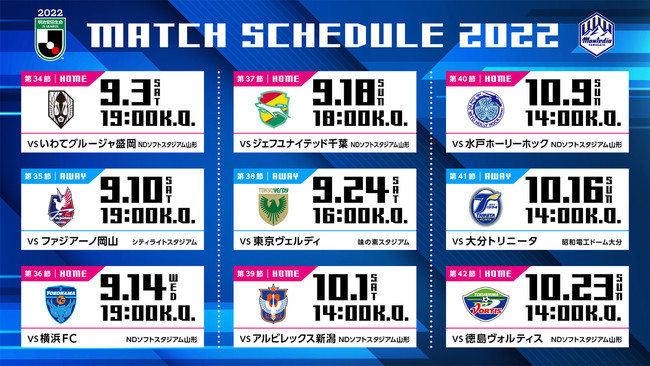 本日2022年7月29日、Jリーグより9月以降のリーグ戦キックオフ時間が発表されました。またスケジュール決定に合わせ、モンテディオ山形のロゴ・エンブレムを手掛けたKEN OKUYAMA DESIGN様デザインによる後半戦のスケジュールポスターが完成しましたのでお知らせします。