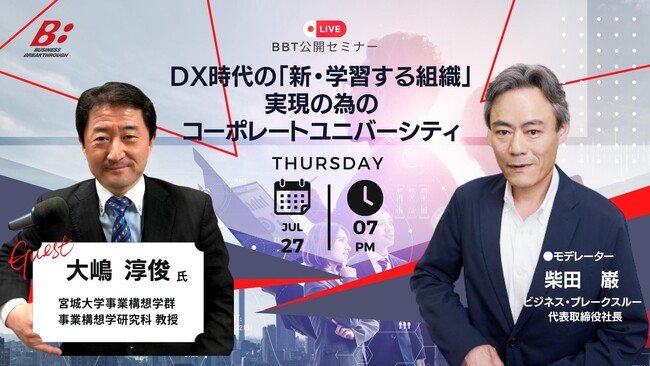 本セミナーでは、BBTの代表取締役社長である柴田巌がモデレーターを務め、特別ゲストとして公立大学法人 宮城大学 事業構想学群/・事業構想学研究科 教授、大嶋 淳俊氏をお迎えします。