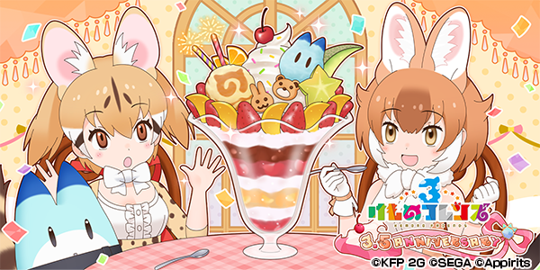 3.5周年キービジュアルは「ようこそジャパリパークへ」のジャケットを彷彿とさせる大きなフルーツパフェが特徴です。ジェネットとドール、ラッキービーストが登場。フルーツパフェのように楽しさがたくさん詰まった『けものフレンズ3』を今後ともご期待ください。