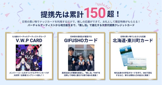 最低ロット一枚からオリジナルカードを発行できる仕組みを活かし、5人組のバーチャルアーティストグループ「V.W.P」から、北海道・東川町などの地方自治体との取り組み、岐阜県立商業高校の高校生による金融事業の実践学習における活用まで、「推し活」をコンセプトにした取り組みが幅広い領域で実現され、提携事例は、サービスリリースから累計で150を超えました。