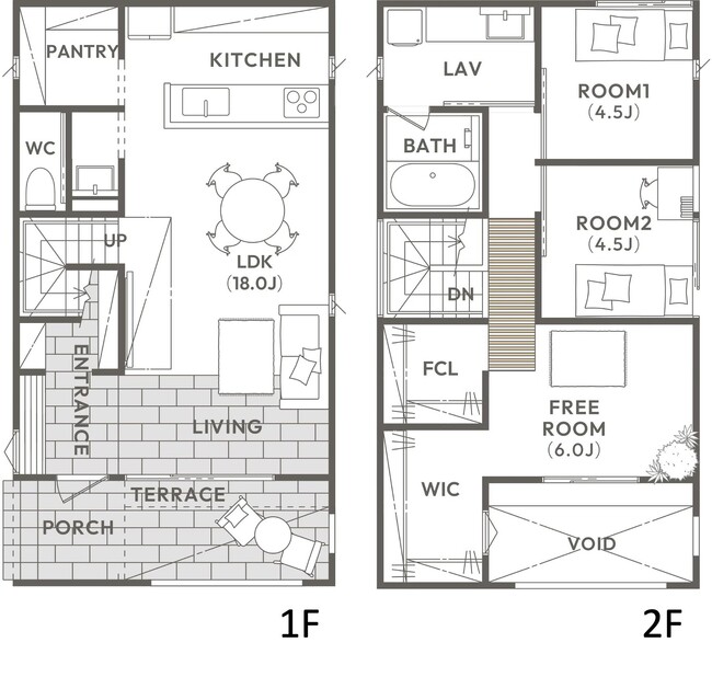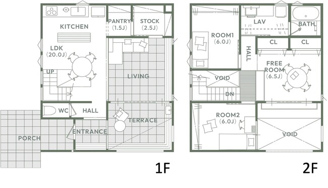 ・南側のグレー部分がタイル空間、玄関ポーチ・テラス・リビング床を合わせ、屋内・屋外をシームレスな