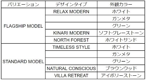 バリエーションは、価格帯の異なる「FLAGSHIP MODEL」と「STANDARD MODEL」の2つに、それぞれ3つの 内外観のデザインスタイルがあります。これらデザインスタイルは、LIXIL グローバル デザインチーム監修のもと、 LDK、バスルーム、トイレ空間、玄関・外観に至るまで住まい全体のトータルコーディネートを提案しています。さら に、「耐震等級3」相当、高い断熱性能を持つ【ZEH水準】の住宅と同等の断熱等級5相当の性能も有しています。