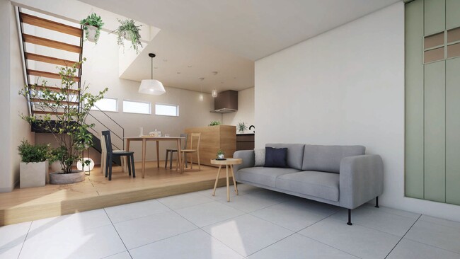 メープルの床材と明るめのグレータイルの組み合わ せはナチュラルで明るく、清 潔感のある空間になっています。木製やライト系の家具は空間全体をまとめ、自 然で 温かみのある調和した空間を作り上げています。外観カラーは、ホワイト、 ガンメタ、グリーンの3パターンを用意しています。