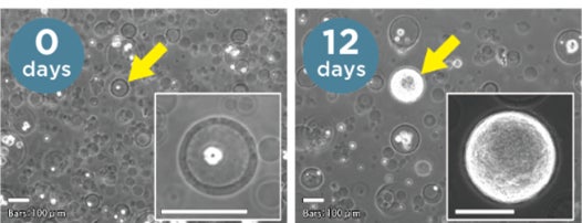 右図は、実際にヒト乳がん細胞由来のMCF-7をAGMTMのカプセル内で培養してスフェロイド化した様子で、12日間で順調に培養ができています。このカプセルには多孔性のアガロースゲルのシェルで数十~数百nm(ナノメートル)の細孔が開いており、封入後もガスや培地成分の交換が容易に行えます。