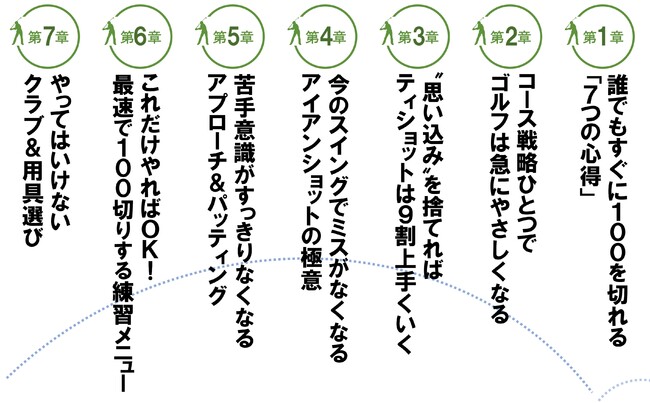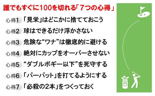 「ティーショットは180ヤードでOK」「絶対にトリプルボギーを打たない方法」「パターはとにかくショートさせる」などなど、練習いらずで100を切るためのメソッドが満載です!