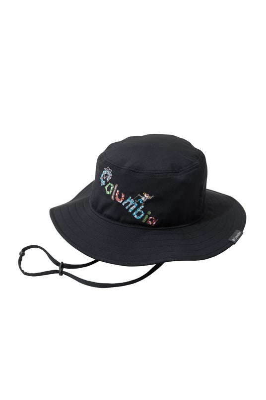 「Columbiaの文字は岩の道をイメージ。ハットの文字の中は私が実際に登山中に見た景色を描きました。上を向いて笑顔で進もう、という想いをこのデザインに込めました。」(アーティスト坪井保菜美氏コメント)