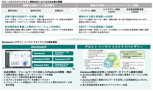 本提携を通して、当社は前述の課題解決を支援する製品の開発・提供を行い、デロイト トーマツは同製品を活用したESGデータドリブン経営のアドバイザリーを行っていきます。両社はゼロボード製品をデータ基盤として位置づけ、各規制対応や第三者保証取得に向けたゼロボード製品の導入・運用・業務オペレーション構築や、蓄積されたデータの企業価値転換を支援していきます。本提携により、グローバルで乱立するサステナビリティ規制への効率的で本質的な対応を包括的に支援してまいります。