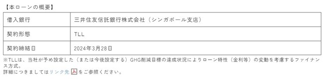 商船三井(以下、「当社」)グループは、本年1月に策定したサステナブルファイナンス・フレームワーク https://www.mol.co.jp/sustainability/management/finance/pdf/sustainable_finance_framework.pdf (以下、「本フレームワーク」)に基づき、トランジション・リンク・ローン(以下、「TLL」)による融資契約(以下、「本ローン」)を三井住友信託銀行株式会社(取締役社長:大山 一也、本店:東京都千代田区)と締結しました。本ローンは、本フレームワークを活用した6件目の資金調達となります。当社グループは、本ローンによって調達した資金を、LNG二元燃料 VLCC船 1隻(以下、「本船」)の建造資金の一部として活用する方針です。