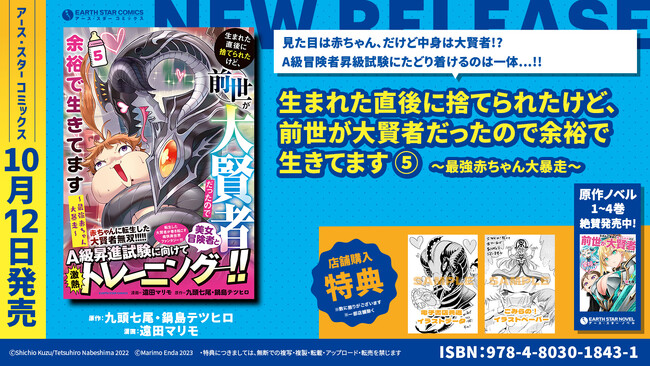 アース・スターノベルにて刊行中のノベルが原作で、現在コミック アース・スター公式サイトにて連載中の人気作品『生まれた直後に捨てられたけど、前世が大賢者だったので余裕で生きてます ~最強赤ちゃん大暴走~』(原作:九頭七尾・鍋島テツヒロ 漫画:遠田マリモ)第5巻を10月12日(木)に発売いたします。