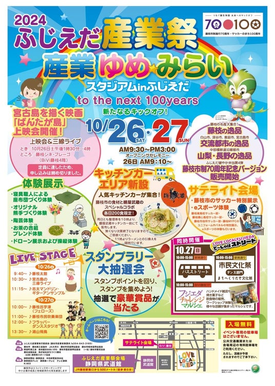 ・市制70 周年・サッカーのまち100 周年記念特別展示を行うほか、市内活動団体によるステージイベントで、産業祭を盛り上げます。