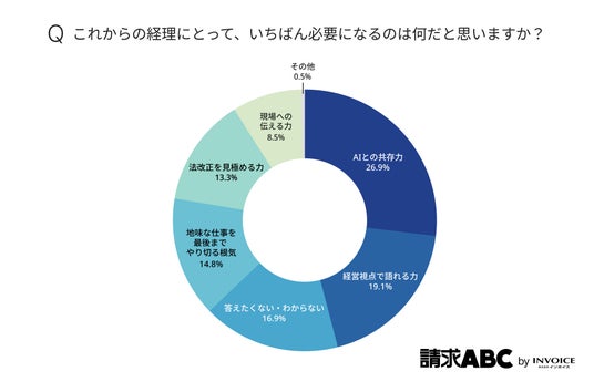 また、今後経理担当に必要とされるスキルに関する調査では、「AIとの共存力」(26.9%)が最も高く、単なるデータ処理にとどまらず、AIを活用した業務効率化や分析力が求められることが分かります。続いて「経営視点で語れる力」(19.1%)が挙げられ、経理業務が単なる事務作業ではなく、経営判断や戦略立案に貢献する役割を持つことが示されています。