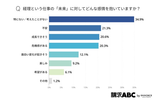 加えて、経理職種の将来性に関する調査では、「特にない/考えたことがない」(34.9%)という回答が最も多く、経理担当者の多くが将来について深く考える機会が少ないことがうかがえます。一方で「不安」(21.3%)や「危機感がある」(20.3%)といった回答は合わせて41.6%となり、多くの人がAIの導入や働き方の変化に対して不安を抱えていることが分かります。