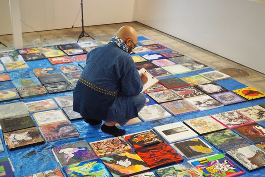 一点一点、丁寧に応募作品をみて一次審査をする妖怪画家(妖怪美術館館長)の柳生忠平