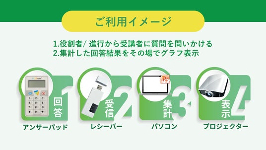 本システムは、”リアル会場では専用端末(アンサーパッド)で投票”し、”オンライン参加者はWEB投票”という、これまで同時運用が難しかった2つの意見集約方式を併用できる仕組みです。それぞれの投票結果は即時に合算しリアルタイムで表示可能です。講演会の一体感と参加意識を高める画期的なシステムです。