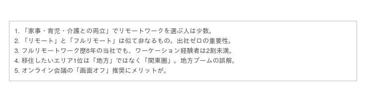 また、「コロナ感染への不安・対策として」が5位に入っており、感染リスクを抑え、安心して働くためにリモートワークを選ぶ人が増えてきている事実もうかがえます。