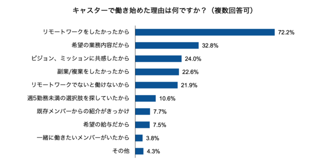 実際に、フルリモート経営をするキャスターへの応募数も右肩上がりで伸びており、2022年4月には3000名以上から応募いただきました。また、社内で実施した「リモートワークと働き方に関する意識調査」でも、入社理由として「リモートワークをしたかったから」が最も多い回答結果(72.2%)となりました。