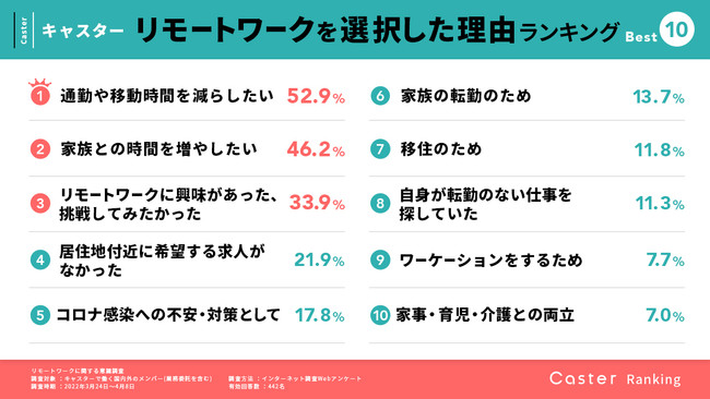 2014年の創業より、メンバー全員(1400人、2022年5月末時点)がフルリモートワークで働く株式会社キャスター(本社:宮崎県西都市、代表取締役 中川祥太、以下キャスター)は、自社で働くメンバーを対象に「リモートワークと働き方に関する意識調査」(有効回答数442名)を実施したところ、世間でのリモートワークのイメージとは異なる興味深い考察を得ることができました。