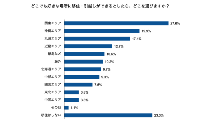石倉:どこでも仕事ができるリモートワークは、「地方移住」の可能性とともに語られることも多いですが、本調査では異なる結果となりました。「どこでも好きな場所に移住・引越しができるとしたら、どこを選びますか?(※移住予算が十分あると仮定して考えてみてください)」という質問に対しては、「関東エリア」が27.6%と最も多い結果に(図表6)。社内にはUターンやIターンをして働いているメンバーもいますが、一概に「リモートワーク=地方移住ブームが来る」とは言えなさそうです。
