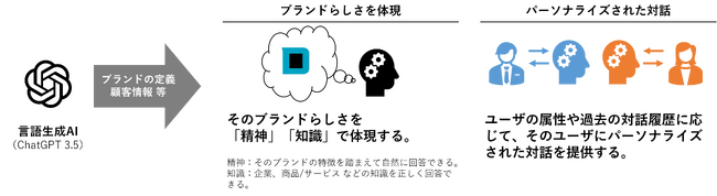 「Brand Dialogue AI」は、AI&機械学習のスペシャリスト集団である株式会社 Laboro.AI(本社:東京都中央区)の支援を受け 大広が開発したブランドの思想に沿って各顧客とOne to Oneの対話を実施するテキスト自動生成エンジンです。OpenAI社のChatGPTにブランドコミュニケーションの起点となるブランド人格を反映したオリジナルの言語生成AIをベースに、各企業が保有する顧客データや商品データ、コンテンツデータを、ユーザーおよび対話内容に応じて瞬時にプロンプトを入れ替える独自技術「ダイナミックプロンプト」で反映することで、ブランドの思想に沿って各顧客とOne to Oneの対話を実施することが可能です。