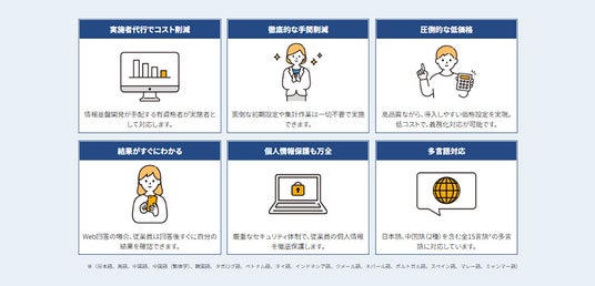 導入しやすい低価格設定ですが、結果を見やすくまとめた分析レポートや紙・WEBが選べる受検システム、製造・建築の現場で好評な15言語※多言語対応、有資格者による実施者代行などストレスチェックに欠かすことができないサービスは標準搭載しています。