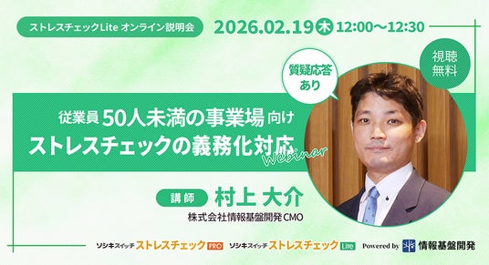 ストレスチェック制度開始時よりサービス提供してきた株式会社情報基盤開発(本社:東京都文京区、代表取締役:鎌田長明)は、「ストレスチェック実施の全事業場義務化」に向けて従業員50人未満の事業場・法人組織・団体向けストレスチェックパッケージ「ソシキスイッチストレスチェックLite」のサービス紹介サイトを公開いたしました。