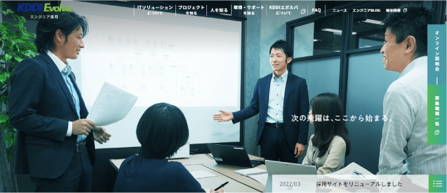 株式会社KDDIエボルバ(本社:東京都新宿区、代表取締役社長:若槻肇、以下KDDIエボルバ)は、幅広い業界における法人顧客のIT戦略をヒューマンリソース×技術力で支えるITソリューションのエンジニア採用強化を目的に、採用サイトを全面リニューアルしました。