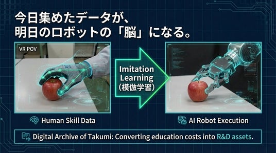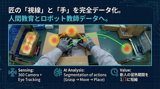 ベテラン熟練工の作業を、アイトラッキング(視線計測)と360度映像で記録・解析します。言語化できない「カン・コツ」をデジタル資産として保存し、まずは新人教育用のVR教材として活用。将来的には、AIロボットの学習用教師データ(Imitation Learning用データセット)としての活用を目指します。