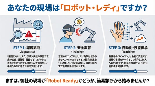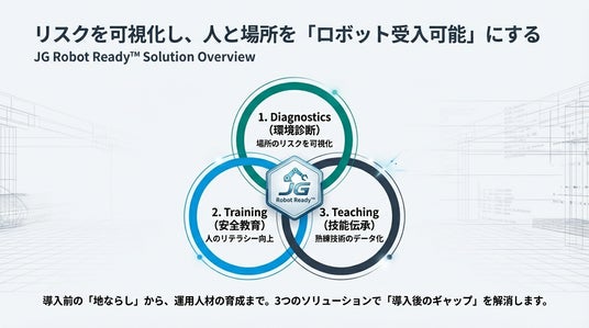 本ソリューションは、ロボット導入前の「走行環境診断」、現場スタッフ向けの「対ロボット安全教育VR」、そして将来の自動化を見据えた「熟練技能デジタル伝承」の3つのサービスで構成され、施設と人材を「ロボット受入準備完了(Robot Ready)」な状態へと導きます。