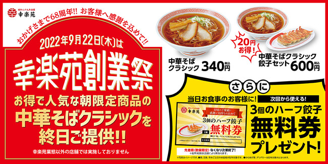 株式会社幸楽苑ホールディングス(本社:福島県郡山市、代表取締役社長:新井田 昇、以下「幸楽苑」) は、2022年9月22日(木)で創業68周年を迎えます。日頃よりご愛顧いただいているお客様への感謝の気持ちを込め、朝限定販売の「中華そばクラシック」を終日ご提供いたします。さらに、当日幸楽苑店舗でお食事いただいたお客様にハーフ餃子の無料券を数量限定でプレゼントいたします。