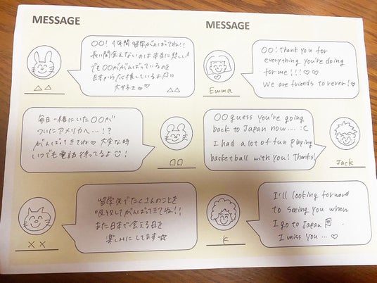 友人や家族にメッセージを記入してもらうぺージ。留学中のホームシック対策