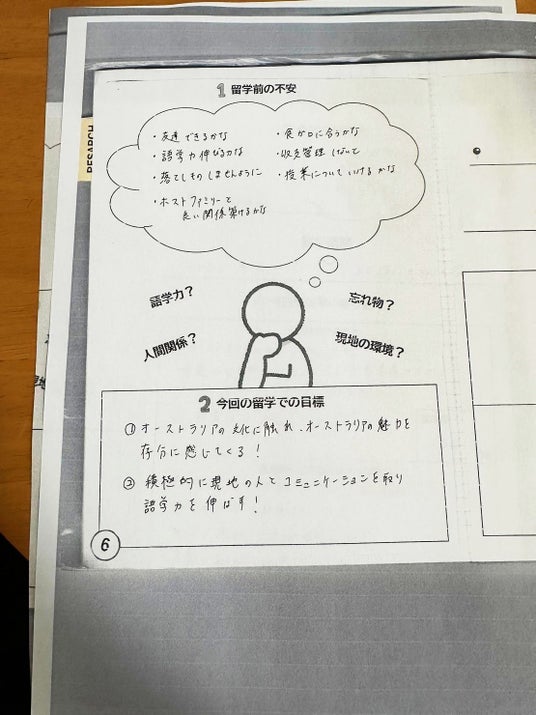 留学前の不安な気持ちや目標を記入するページ