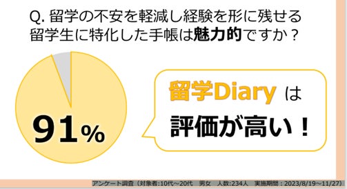 ・留学の不安を軽減し経験を形に残せる留学生に特化した手帳は魅力的ですか?というアンケートを行った。91%の人が「魅力的」と回答
