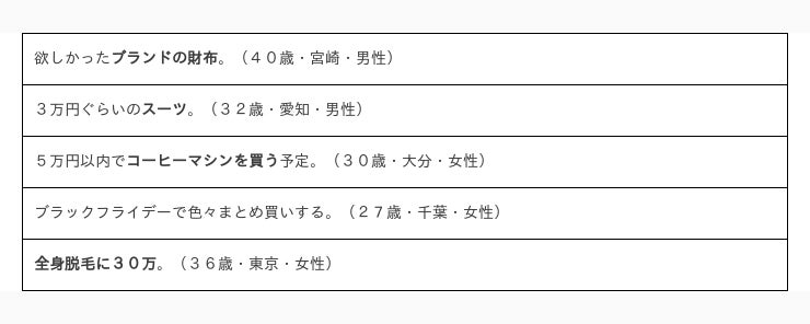 「自分のための買い物」をすると答えた人に、何を買うのか聞いてみました。