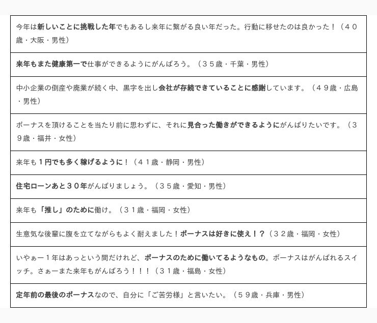 冬のボーナスは1年間の労働へのご褒美のようなものではないでしょうか。最後は1年間がんばって働いた自分へのメッセージです。今年もみなさん、お疲れさまでした!