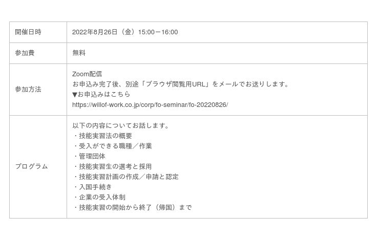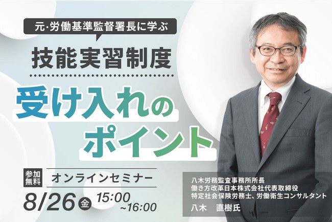 ウィルグループの総合人材サービスを手掛ける株式会社ウィルオブ・ワーク(本社:東京都新宿区、代表取締役社長:告野 崇)は、労働基準監督署長の経験を持つ、八木労務監査事務所(本社:千葉県市川市、代表者:八木 直樹)所長の八木 直樹氏をお招きし、無料オンラインセミナー『元労働基準監督署長に学ぶ 技能実習制度受け入れのポイント 』を、2022年8月26日(金)に開催します。