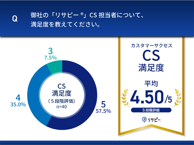 CS)満足度調査では、5段階中「4.47」という非常に高い評価をいただきました。その内訳としては、全てのお客様が5段階評価で「3」以上、かつ57.5%のお客様が5段階中「5」を回答。さらに知人・他事業部への「リサピー(R)︎」サービス推奨度では、10段階中平均「8.45」という結果となりました。