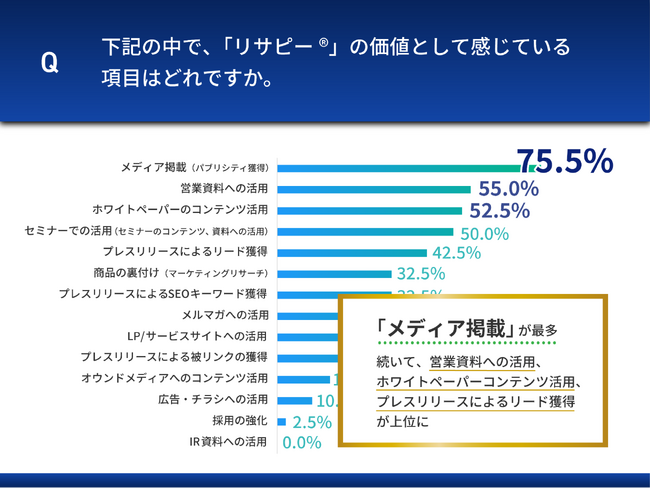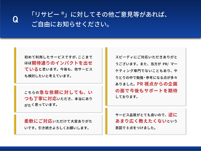このたびのCS満足度調査では、多くのお客様が特に「メディア掲載」や「営業資料への活用」「ホワイトペーパーのコンテンツ活用」といった項目において、「リサピー(R)︎」サービスの価値をご実感いただいていることがわかりました。今回の結果を励みに、さらにお客様に寄り添ったサービスに磨きをかけ、顧客の成功に貢献してまいります。
