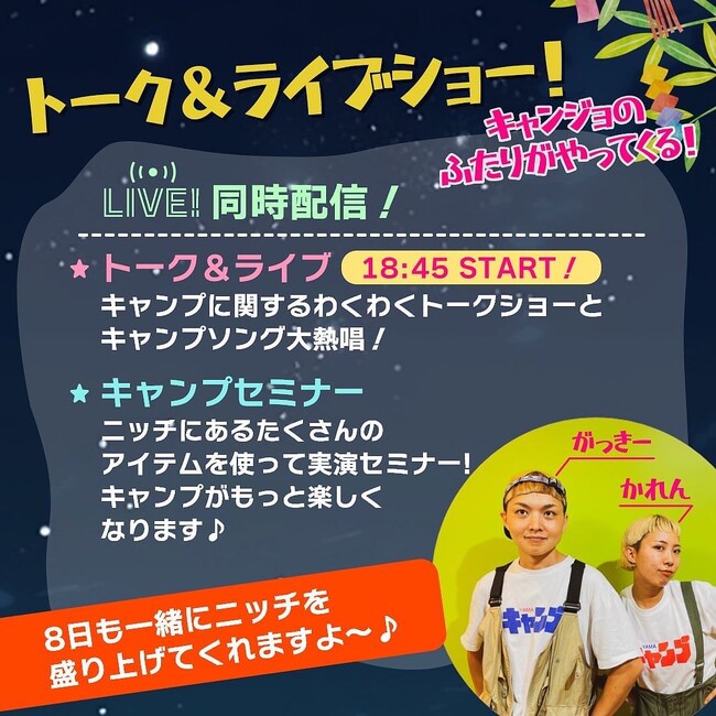 キャンジョバンドはトーク&ライブとして、人気キャンプソング『キャンプだホイ!』を大熱唱!後半は、ニッチリッチキャッチにて販売中の商品の中から、『夏のキャンプ』をテーマにした商品を20アイテムセレクトし、約40分に渡るインスタライブを開催しました。